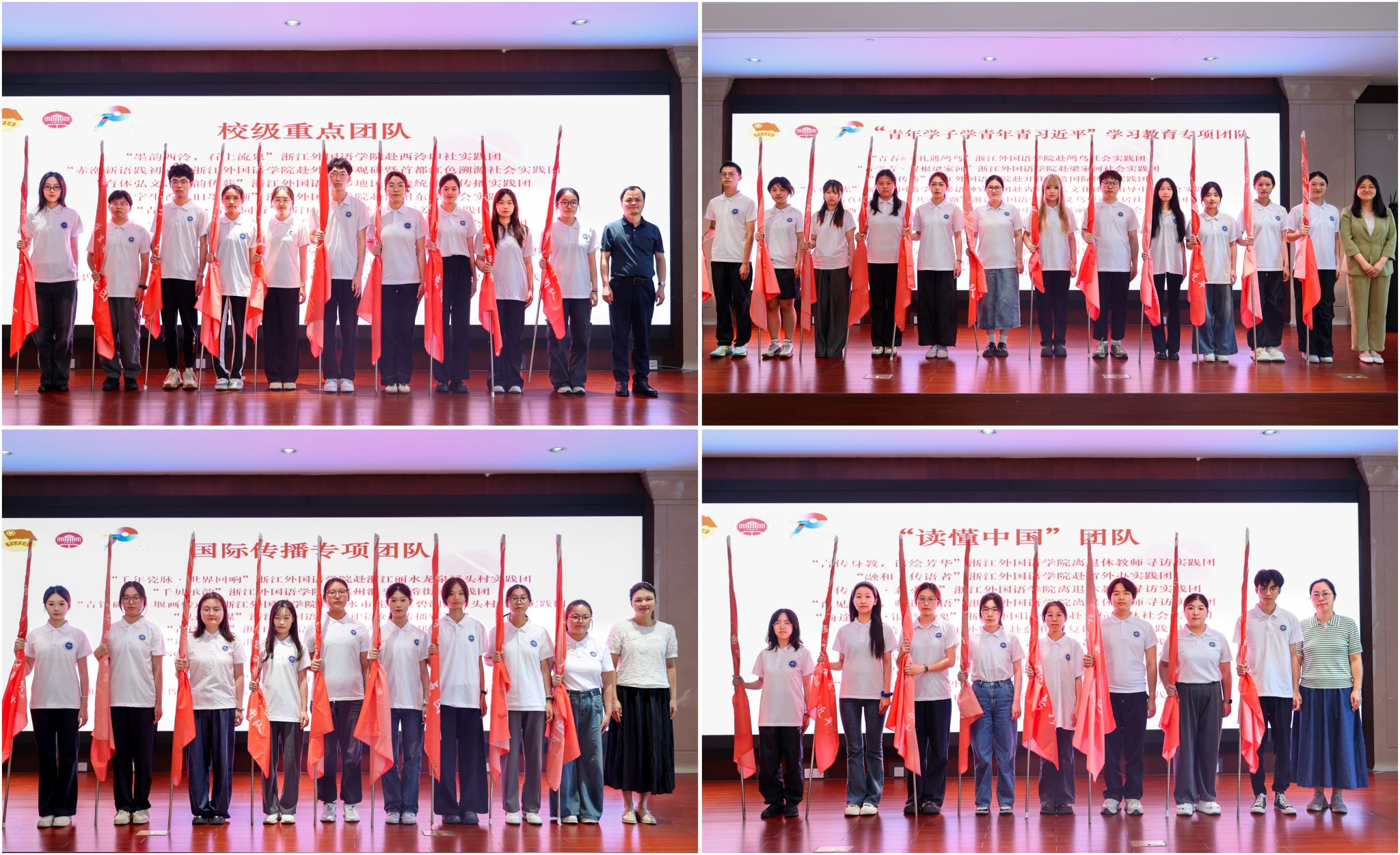 仪式上,有关职能部门分别向校级重点团队、“青年学子学青年习近平”学习教育专项实践团队、国际传播专项团队、“读懂中国”专项团队、“校友”寻访专项团队、马克思主义学院“红色”专项团队以及地方专项团队授旗。这些旗帜不仅是行动的标识,更代表着青年学子在不同领域践行责任担当的决心,他们将以行动践行誓言,让青春在党和人民最需要的地方绽放绚丽之花。