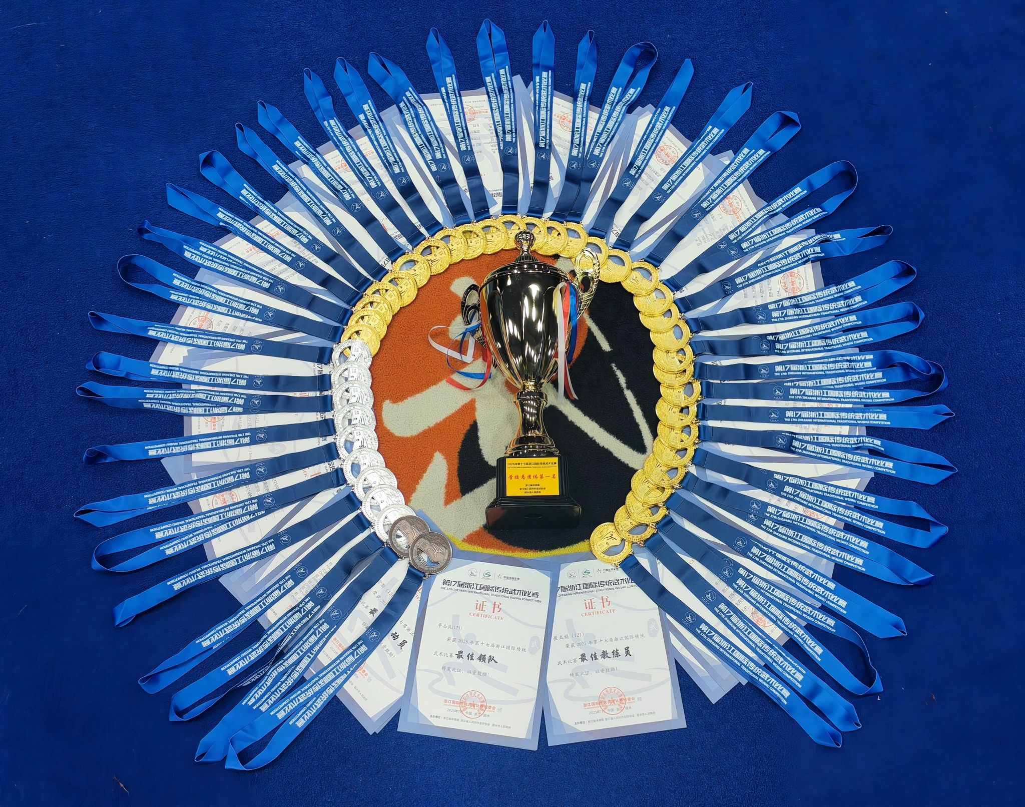 7月20日,2025年第17届浙江国际传统武术比赛在丽水落幕。赛事中,浙外武术队表现抢眼。在体育部吴炜、李志良、崔文娟三位老师的悉心指导下,浙外武术队14名队员经过两天鏖战,以31金9银2铜的优异战绩,刷新校队单次赛事奖牌总数纪录,更首次实现全体参赛队员“人人夺金”的历史性突破,学校还捧杯“学校总团体冠军”。李志良老师荣评“最佳领队”,崔文娟老师获评“最佳教练员”,楼俞灏同学获男子青年组个人全能第七名及“最佳运动员”称号。