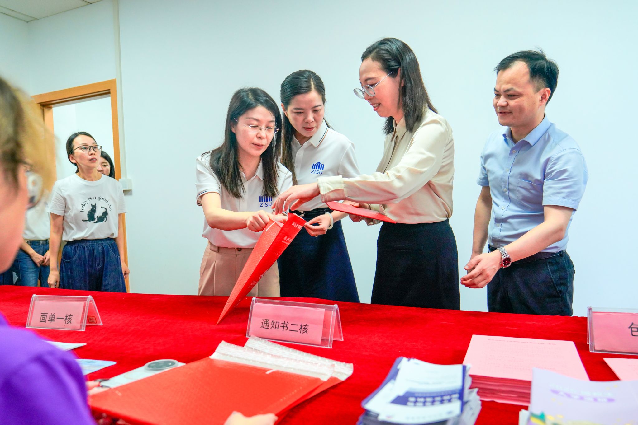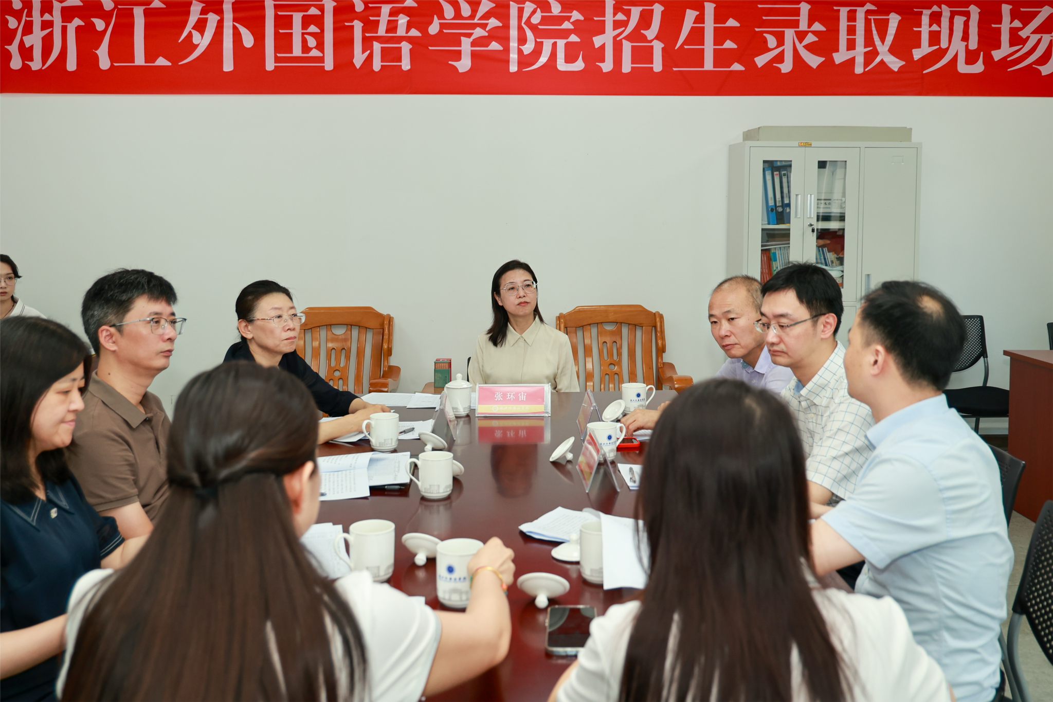 招生录取现场一派繁忙景象,张环宙仔细听取了今年招生工作汇报,并亲手为考生封装录取通知书,为新浙外人送出深深的祝福。“‘读外语就要选浙外’,考生和家长对我们的评价就是社会美誉度的一个缩影,是对学校‘外’字特色的充分认可。”她指出,今年招生工作取得的成绩较好达到了预期,有的方面还超出预期,这和前期全校上下的努力付出密不可分。针对下一步工作,她强调,要高度负责、严谨细致做好后续招生录取工作,确保平稳有序完成;要深度总结、科学分析招生数据,为学校人才培养、专业建设等提供依据;要一体化、全链条推进招生培养就业工作,深耕“语言+专业”复合型人才培养模式,构建多维度毕业生评价体系,为服务浙江高水平对外开放提供有力的人才支撑。