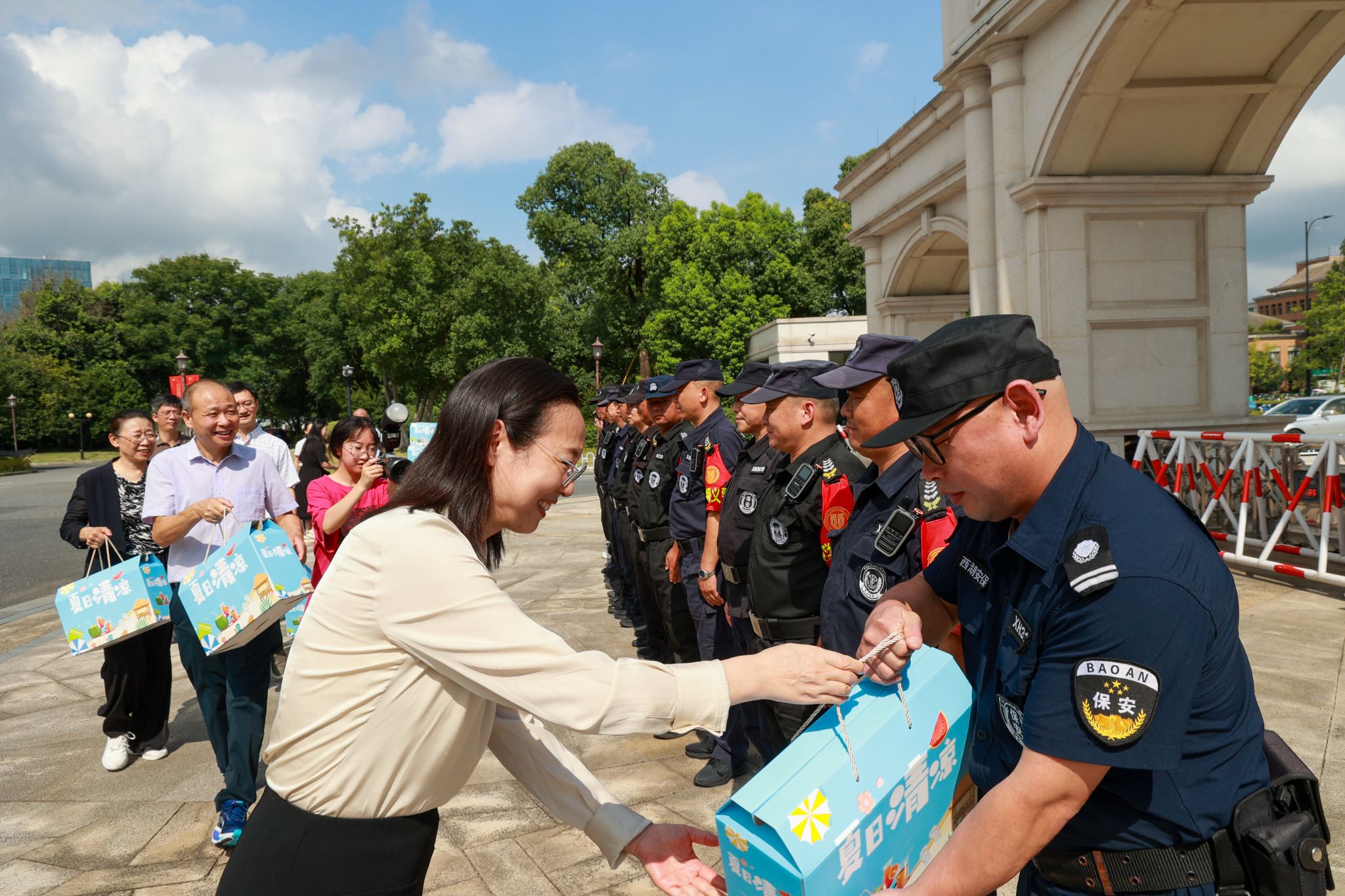 在安保部、人武部,张环宙对大家在酷暑中坚守岗位、全心全意守护校园表示感谢。她指出,大家不仅是校园平安的守护者,更是学校对外展示的窗口。“那位能用六种外语服务的保安师傅受到媒体的关注报道,这正是咱们浙外外语氛围浓厚的体现之一。”一番话让在场工作人员备受鼓舞。