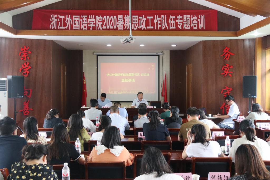 为深入学习贯彻习近平总书记考察浙江重要讲话精神,在“重要窗口”建设中推动新时代学生思想政治工作,进一步加强思政工作队伍建设,提升思政工作水平,构建“三全育人”格局。9月2日-4日,浙外举办2020年暑期思政工作队伍“学习‘重要窗口’建设精神,提升学生思政工作水平”专题培训。校党委副书记赵文波出席并讲话。
