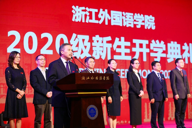 典礼分为“浙外启航”“志通天下”“浙里有你”三个篇章。在庄严的国歌声中,典礼拉开序幕。洪岗对全体新生表达了欢迎和祝福,并以“厚植家国情怀,勇担时代使命”为题寄语新生。结合“明德弘毅、博雅通达”的校训精神,洪岗勉励新生: