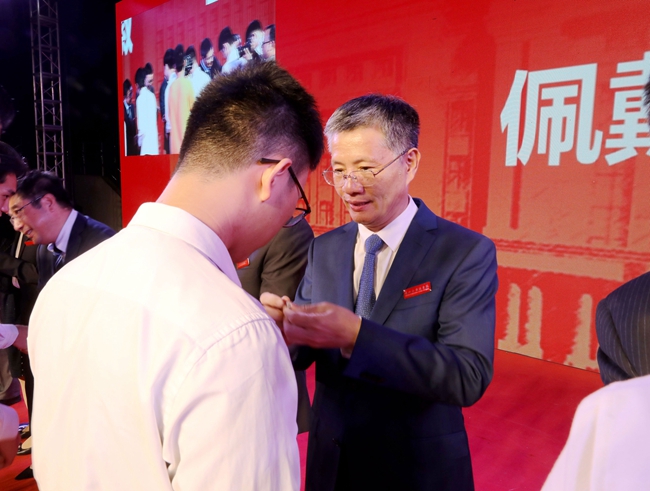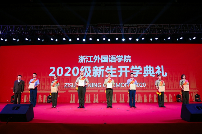 典礼上,校党政领导班子成员和各学院领导为新生代表佩戴校徽。戴上校徽,全体新生正式加入浙外大家庭,与浙外一同书写新时代的奋进之笔。