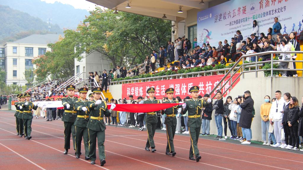伴随着清澈响亮的口号,护旗手们迈着整齐干脆的步伐走向旗杆。庄严悠扬的国歌响起,全体师生注视着五星红旗冉冉上升。大家齐声高唱《义勇军进行曲》和《浙外校歌》,嘹亮的歌声萦绕在浙外校园,鲜艳的五星红旗、校旗和会旗飘扬在田径场的上空。
