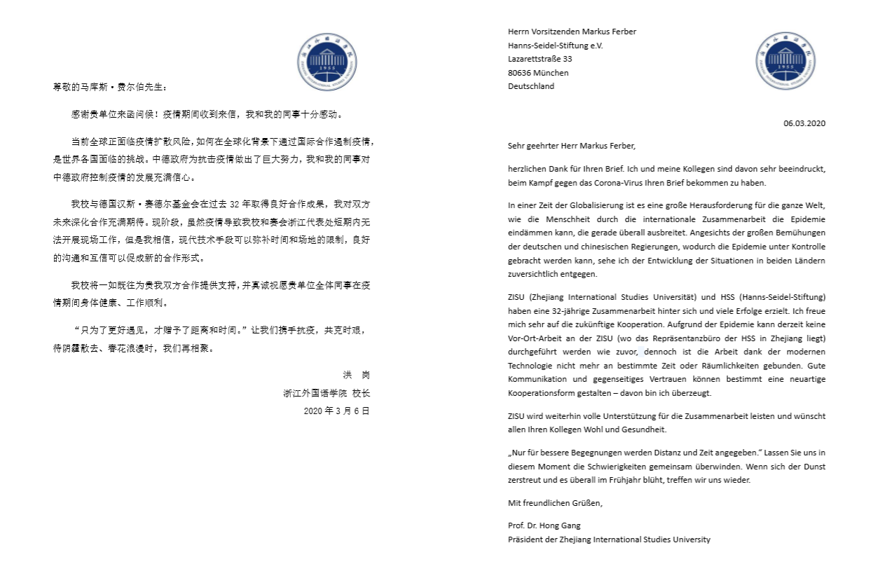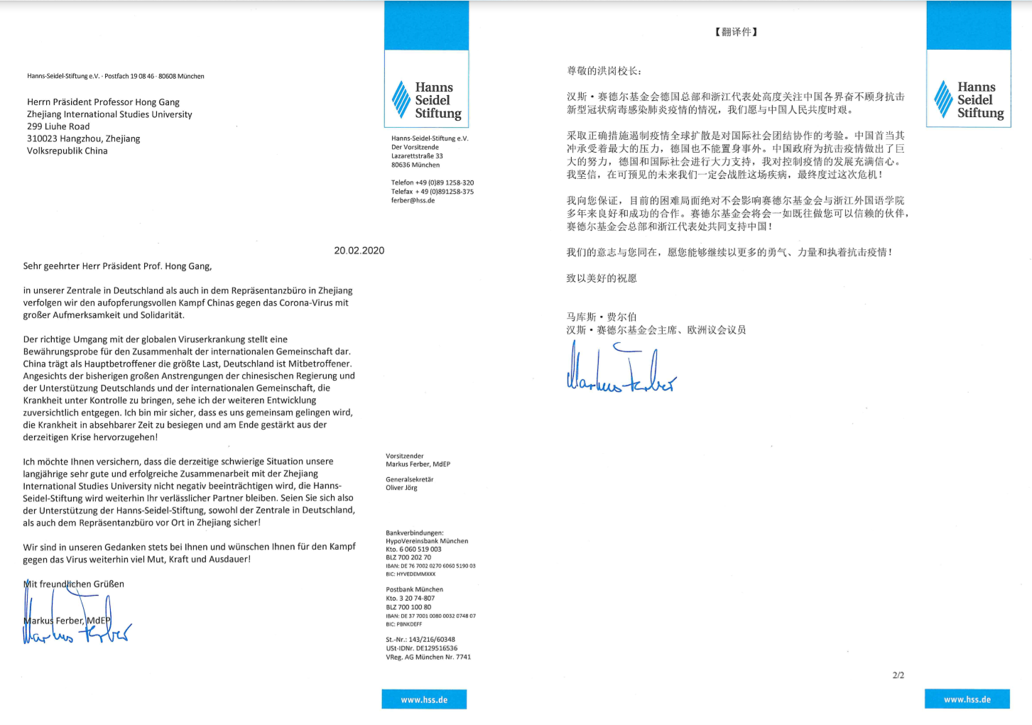 在防控疫情吃劲的关键时刻,德国汉斯·赛德尔基金会致信浙外,表达了对中国人民的支持和祝福。目前,全国疫情防控形势积极向好的态势拓展,经济社会发展加快恢复。校长洪岗向基金会回信,对基金会的真挚慰问表示了感谢。