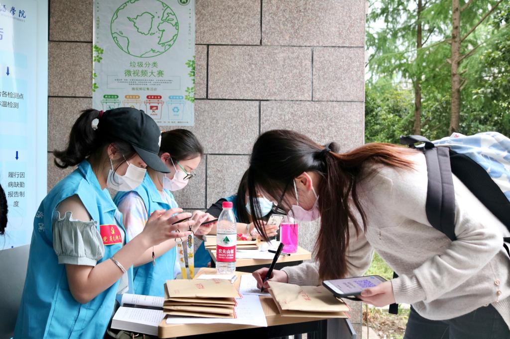“欢迎回校,请出示一下校园码。”“请测一下体温。”“这是防疫物资,请保管好。”——这是来宿舍楼下测温点的对话。