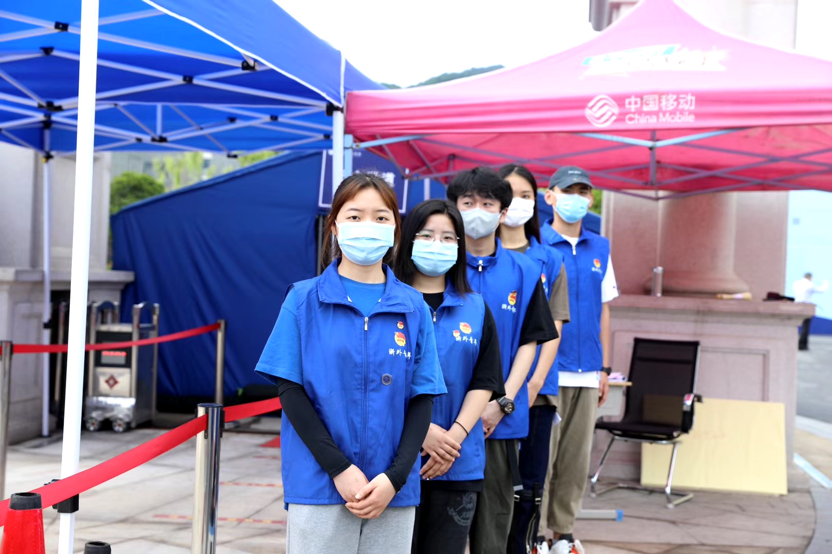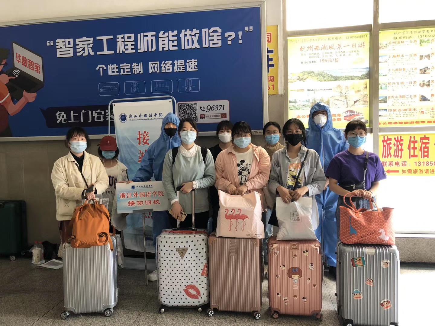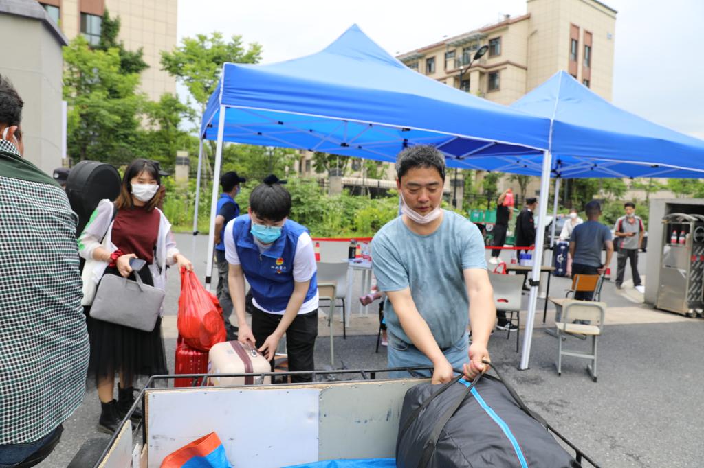 5月15日起,浙外大一大二大三学子分批有序返校。这一天的凌晨,学校的接站任务便紧锣密鼓地开展。夜里下过一场大雨,到早晨雨止放晴。老师及志愿者们早早地在自己的岗位上待命,从车站、机场接站到校内引导,所有流程都准备妥当,迎接当天回校的大三学子。