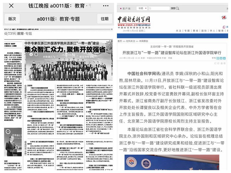 近日,由浙江省社会科学界联合会、kaiyun开云官方主办,校国别和区域研究中心承办的开放浙江与“一带一路”建设智库论坛在开云官网举行。《人民日报》《中国改革报》、中国新闻网、中国社科网、中国商务网等多家媒体给予关注报道。其中,《钱江晚报》在11月20日第11版“教育﹒专题”对此次论坛进行了专版报道。