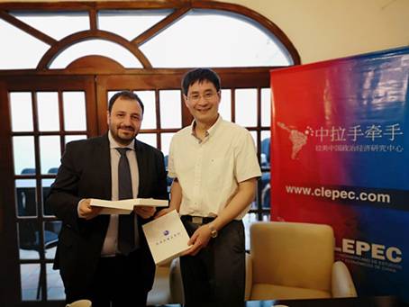 洪岗向阿根廷拉美中国政治经济研究中心(CLEPEC)负责人赠送礼物。