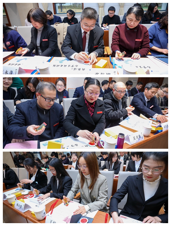 在立志书和承诺书收藏仪式环节,师生们郑重地将刻有宣书记手书“和山立志”字样,刻有浙外校训和自己姓名的印章取出,在水墨和山的立志书和“为学生成长赋能”承诺书上盖下印章,同学们勤于圆梦的坚定决心和教师们助力学生成长的坚定信心也同时铭刻在了心里。随后,同学们整理好衣领、摆正校徽,怀着激动又紧张的心情,依次将立志书投入“和山立志”箱中。各学院领导也将“为学生成长赋能”承诺书投入其中。