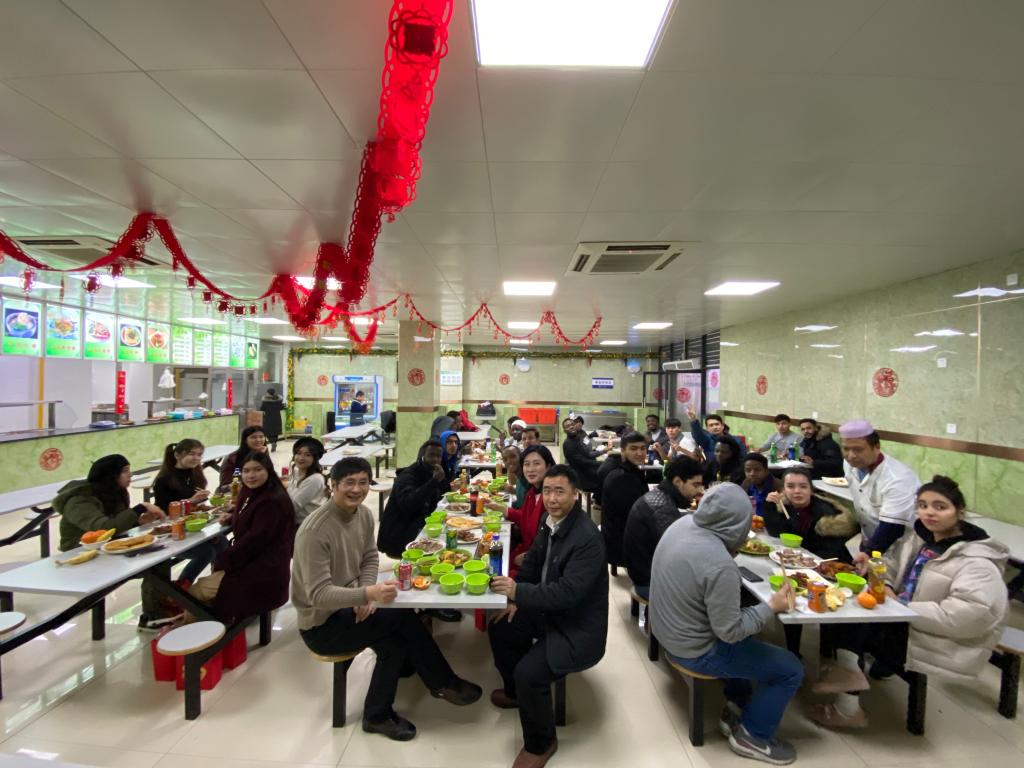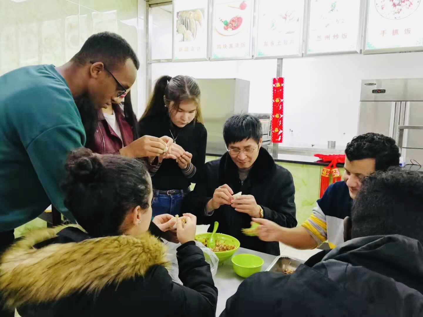 傍晚,洪岗和学生们一道来到民族餐厅,进行了中国人过年不可缺少的一个重要环节 -- 包饺子、吃团圆饭。 留学生们对饺子的制作过程陌生又好奇,洪岗亲手示范、仔细讲解,很快同学们都摸到了窍门,像模像样地包出了不少白白胖胖的饺子。谈笑声、碰杯声、祝福声中,浓浓的年味在留学生之间飘散开来。