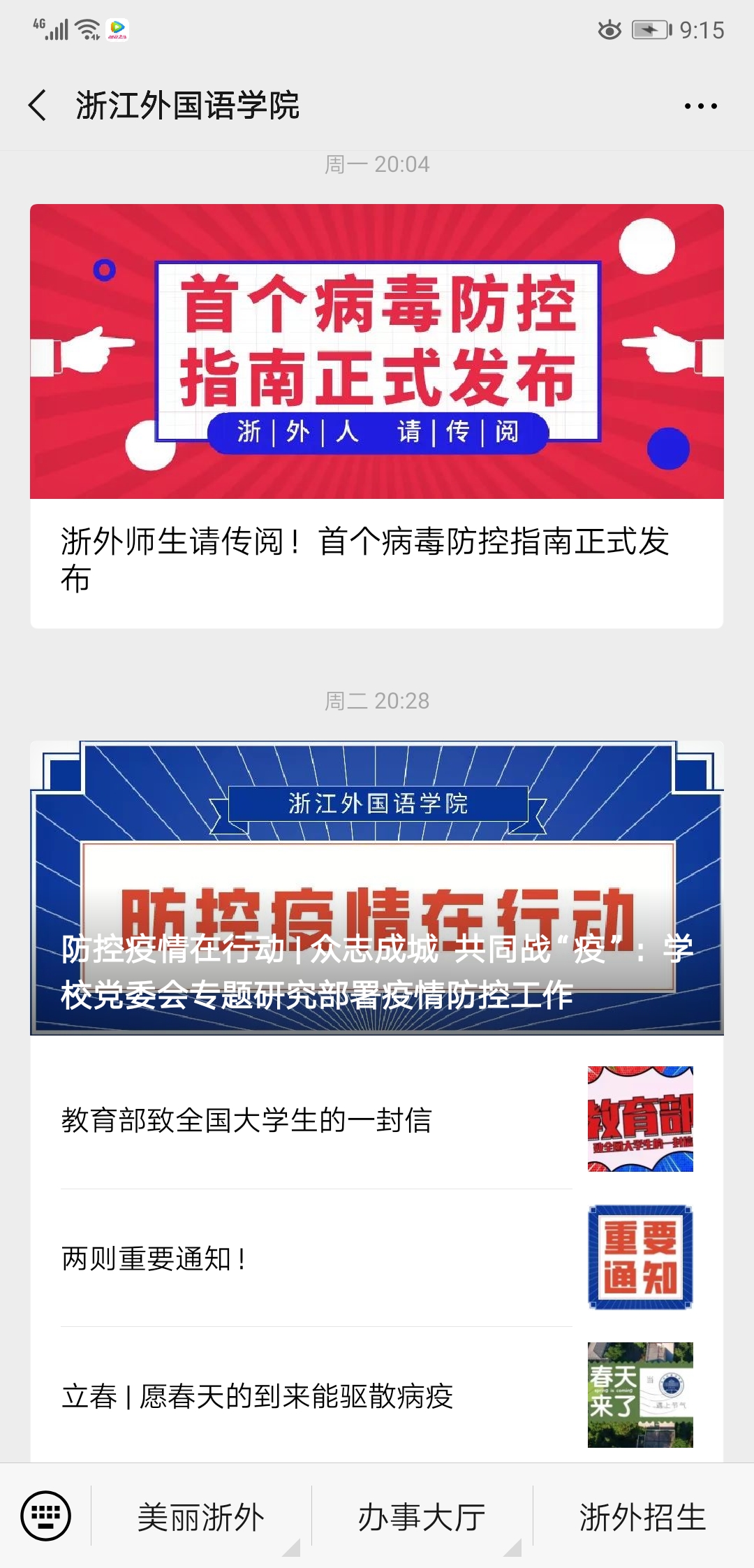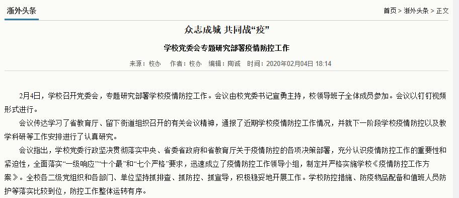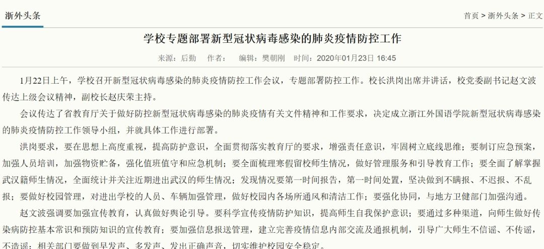 生命重于泰山,疫情就是命令,防控就是责任。学校第一时间快速启动防控疫情一级响应。第一时间发布《关于进一步做好新型冠状病毒感染的肺炎疫情防控工作的通知》并详细部署疫情防控工作;第一时间召开疫情防控专项工作会议学习传达上级指示和部署;第一时间成立新型冠状病毒感染的肺炎疫情防控工作领导小组和6个专项工作小组;第一时间制定《新型冠状病毒感染肺炎疫情防控工作方案》;第一时间发布《致全体浙外师生的一封公开信》; 第一时间组织动员全体党员发挥党组织战斗堡垒作用和共产党员先锋模范作用; 第一时间普及防疫工作相关知识,报道学校防疫工作动态……浙外全校上下一心,坚决打赢疫情防控阻击战。
