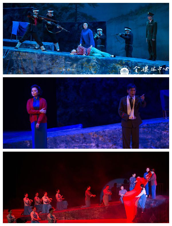 “山可移,海可填,我的心不变!”当看到江姐在“中美合作所”渣滓洞集中营被沈养斋审讯这一幕时,江姐铿锵有力的回答赢得场下观众雷鸣般的掌声。在渣滓洞集中营女牢中,江姐身着蓝色旗袍,收到从狱外的消息:毛主席在天安门广场上宣布“中华人民共和国成立了”,狱中一行人激动的喊出“中国万岁,中国共产党万岁,毛主席万岁!”但对于江姐而言,此时她的生命也即将走到终点,她把生的机会留给别人,把死亡留给自己。在轻柔的音乐中,她套上红色外套,戴上白色围巾,将织好的五星红旗交给身后的队友,用唱曲表达“党的女儿”对党的一片赤诚之心,鲜艳的五星红旗在身后的大幕上熠熠生辉,《红梅赞》《绣红旗》等经典旋律回荡在每个人心里,场下的掌声经久不息。