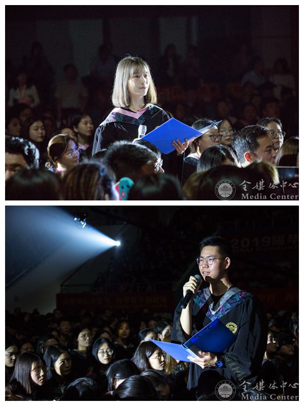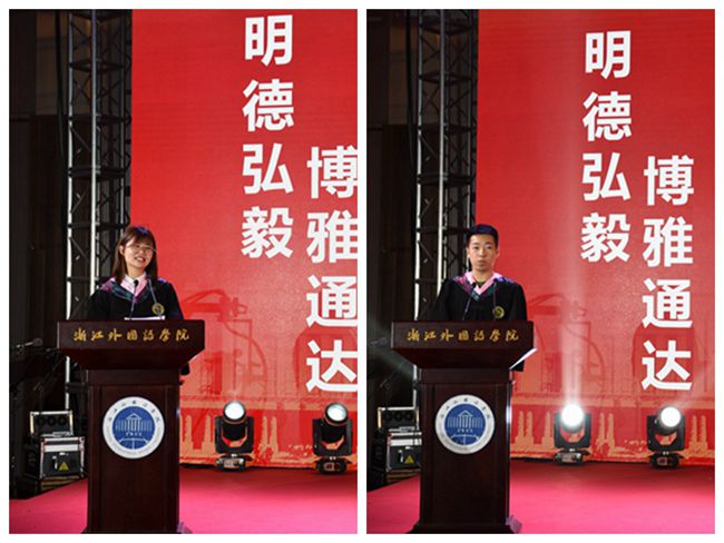 2015级小学语文教育1班杨远凯、2015级英语翻译1班潘慧超两位同学分别作为毕业生代表发言。他们讲述了自己在浙外的成长和收获,表达了对老师、同学、母校的不舍和眷恋,以及对未来的美好期待。