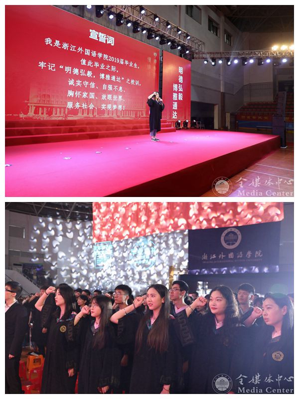 在鲜艳的国旗下,全体毕业生举起右手,一起向祖国和母校庄严宣誓,他们将铭记校训精神,带着浙外的烙印扬帆远航。