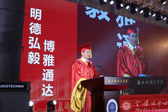 “今天开始你们将离开校园,开启另一段美好的旅程。作为新时代的中国青年,你们处在中华民族发展的最好时期,既面临着难得的建功立业的人生际遇,也面临着‘天将降大任于斯人’的时代使命。” 面对新征程,洪岗寄语学子,“希望大家要珍惜这个时代,继续秉承浙外校训精神,担当时代责任,争做时代新人,让青春在新时代改革开放的广阔天地中绽放,让人生在实现中国梦的奋进追逐中闪光。”