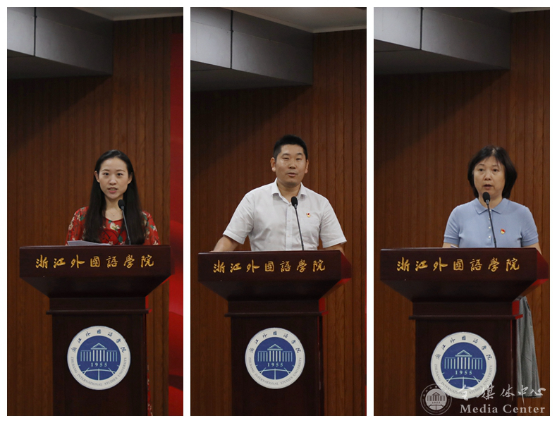 西语学院教师、意大利语系党支部书记马素文,英文学院党总支副书记刘涛,东语学院党总支书记王永青,分别作为优秀共产党员、优秀党务工作者、先进基层党组织代表在会上发言,他们通过分享个人成长经历或基层党务工作心得感悟,表达了对党的忠诚、对教育事业的热爱以及不忘初心、奋力前行之志。