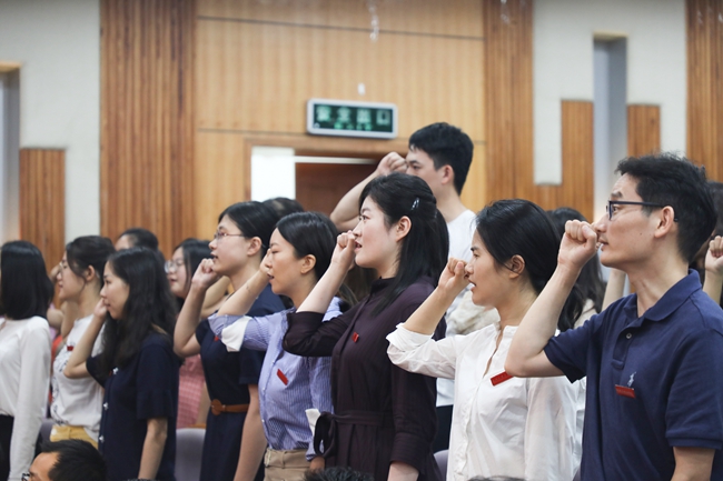 在省师德先进个人王敏娴的带领下,新入职教师代表进行宣誓仪式。