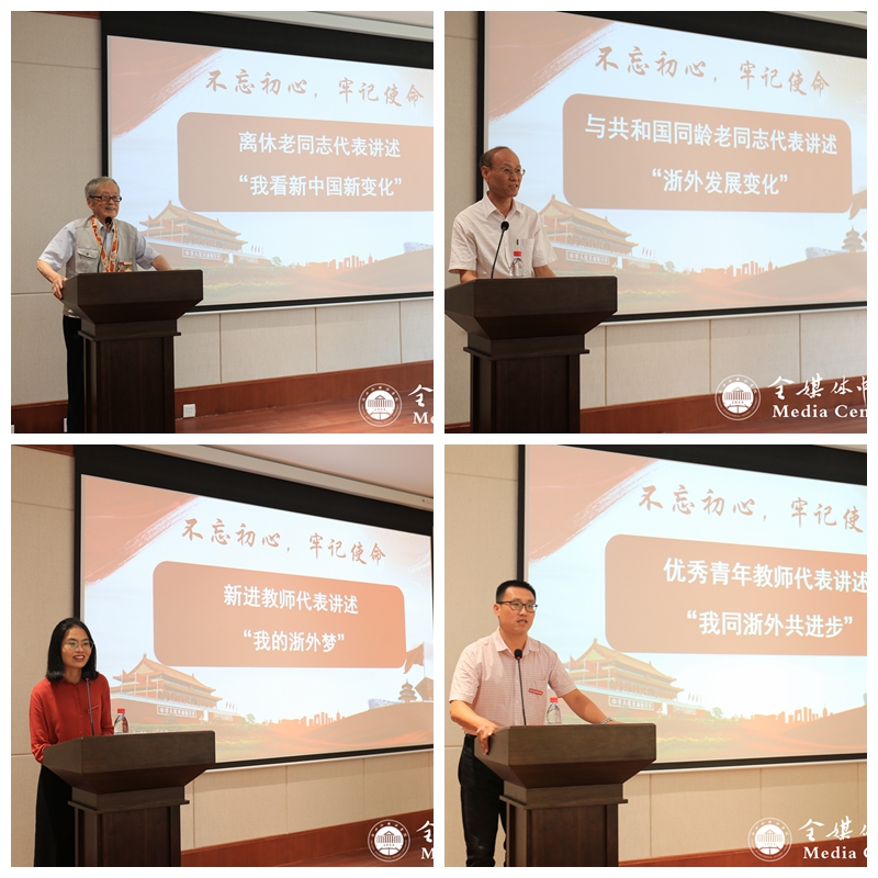 在庆祝新中国成立70周年“与祖国同成长、与浙外共进步”主题活动环节,离休老同志代表盛瑞生、与共和国同龄老同志代表陈宗明分别讲述了“我看新中国新变化”和“浙外发展变化”,两位长者娓娓讲述新中国成立70年来的历史变革和辉煌成就,以及学校曲折奋斗历程所带来的深刻变化和深切感受,使在场的人无不动容。优秀中青年教师代表宋树理、新教师代表李永花表示,浙外发展的交接棒已由老一辈交到了新一代教师手中,他们会不忘为人师表初心,时刻牢记立德树人的使命,凝心聚力实现浙外梦。30余位新教师们还纷纷用一句话表达了自己的梦想心声和奋斗决心。