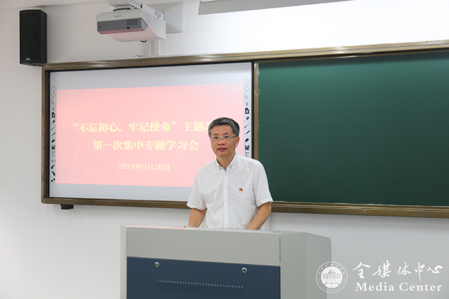 金秋的浙外,气爽怡人,新校园内印有“不忘初心、牢记使命”字样的旗帜,迎风飘扬。根据省委要求,9月20日,学校举办“不忘初心、牢记使命”主题教育第一次集中专题学习会。校党委书记宣勇、校长洪岗等校党政领导班子成员,校党委理论学习中心组成员和各党总支(直支)书记全程参加学习会。