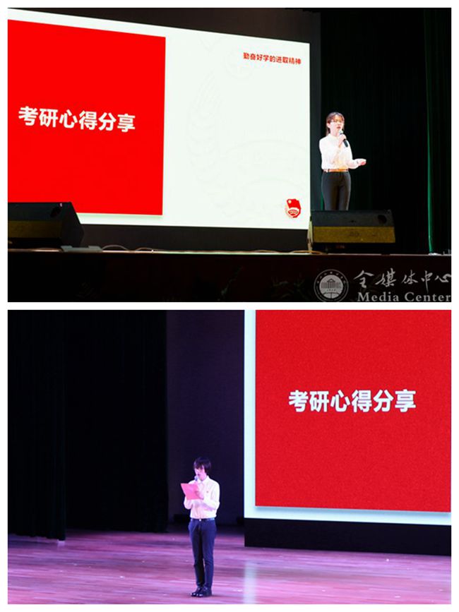 研途漫漫,考研过程中酸甜苦辣又有谁知?考上北大日语口译研究生的东语学院周吕燕和被威斯康星大学麦迪逊分校录取的西语学院俞吴祺两位同学,现场分享了他们追梦圆梦的故事。“从青年习近平的身上,我看到他为梦想而努力,给了我前进的力量。每当我想放弃的时候,总会有一个声音在耳旁激励我,他说你可以,因为你有梦想。”在他们身上,我们看到了拼搏奋进、苦尽甘来。