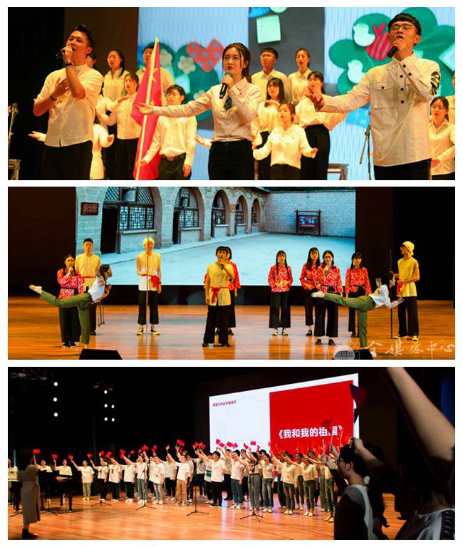 (图片依次是:“青马”学员合唱:《不忘初心》;艺术学院、校朗诵社:《梁家河的远行》;The New合唱团:《我和我的祖国》)