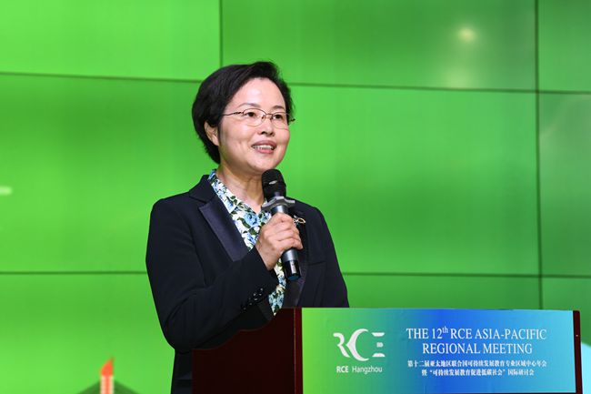 陈国妹指出,“落实可持续发展议程是当前国际发展合作的共同任务,也是国际社会的共同责任。” 中国政府十分重视走可持续发展道路,统筹推进经济建设、政治建设、文化建设、社会建设、生态文明建设,取得了丰硕的成果。中国提出的“一带一路”倡议,秉持共商共建共享原则,与可持续发展目标宗旨一致、理念相通、路径相同,共建“一带一路”就是建设绿色发展之路。她表示,浙江省地处“一带”与“一路”交汇地带,杭州市委市政府高度重视经济社会与自然协调发展,本次亚太地区联合国可持续发展教育专业区域中心年会在杭州召开,深感荣幸,同时备受鼓舞,将以更坚定的信念、更昂扬的精神,落实创新、协调、绿色、开放、共享的发展理念,构建人与自然和谐发展的新格局。