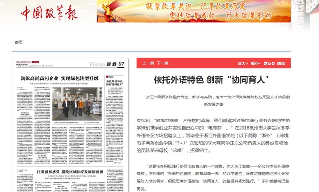 据悉,浙外自2017年被列为浙江省应用型本科试点高校后,除了积极打好“跨境电子创业学院‘3+1’实验班”这张牌外,“协同育人”“复合培养”的高教理念已深入浙外,这不仅体现在试点专业的建设上,更是渗透到课程体系的构建上。浙外融合专业、教学与实践,走出了一条外语类高等院校应用型人才培养的创新发展之路。