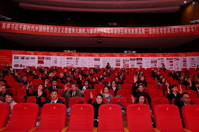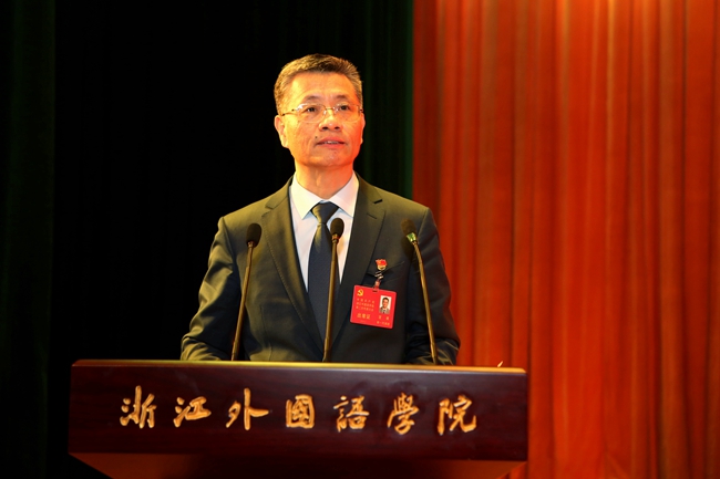 大会号召,全校各级党组织、全体共产党员和师生员工,要以习近平新时代中国特色社会主义思想为指导,深入贯彻落实党的十九大精神,在浙江省委、省政府的正确领导和上级主管部门的大力支持下,主动对接“一带一路”建设,积极服务开放强省战略,奋力谱写新时代内涵式发展的新篇章,着力建设浙江省国际化人才培养的重点基地、服务浙江开放强省的智囊高地、浙江国际文化教育交流的重要阵地,在实现中华民族伟大复兴中国梦、推进浙江“两个高水平”建设的宏伟征程中充分体现浙外担当、作出浙外贡献、显示浙外力量,为把学校建设成为国内知名外语特色鲜明教育品质一流的应用型高校而不懈奋斗。