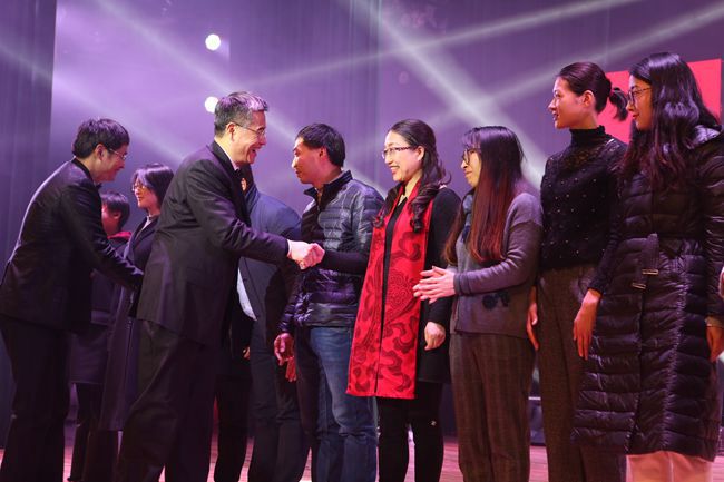 晚会对2018年获得省级及以上荣誉的部分教师代表、取得优异成绩的学生代表进行了表彰。宣勇、洪岗与师生们一一握手,并颁发证书,赠送鲜花,表达对他们真诚的祝贺、感谢与敬意,希望老师们再接再厉、潜心育人,学生们勤奋好学、团结奋进,共同营造“老师爱学生爱学术,学生爱学习爱学校”的良好氛围。
