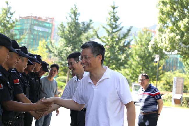 宣勇、洪岗一行亲切看望正在执勤的保安人员,并与他们一一握手,感谢他们为学校的安保工作尽职尽责。