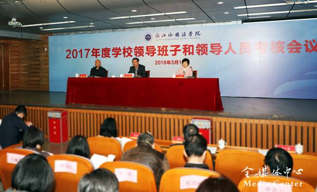 宣勇指出,2017 年是学校“十三五”规划纲要执行的奠基之年,是学校迎接教育部本科教学工作合格评估之年。一年来,在省委省政府的正确领导和上级有关部门的关心支持下,学校领导班子强化理论武装,带领全校上下认真学习贯彻习近平新时代中国特色社会主义思想;坚定信念立场,严守政治纪律和政治规矩;贯彻新发展理念,助力“六个浙江”建设;加强思想政治建设,扎实推进“两学一做”学习教育常态化制度化;认真落实中央八项规定、省委“28 条办法”,持之以恒纠正“四风”;坚持依法决策,带头尊法学法守法用法;发挥特色优势,推动省委、省政府重点工作在学校贯彻落实;落实全面从严治党主体责任,履行好“一岗双责”;抓住“关键少数”,认真组织开展干部教育培训工作。学校按照“五位一体”总体布局和“四个全面”战略布局,坚持创新、协调、绿色、开放、共享的发展理念,全面贯彻党的教育方针,以迎接教育部本科教学工作合格评估为契机,以推进国际化特色高校建设为重要抓手,坚持改革创新,全面提升教育质量,较好地完成了年初确定的各项工作目标,为开创学校“十三五”时期发展新局面奠定了坚实的基础。