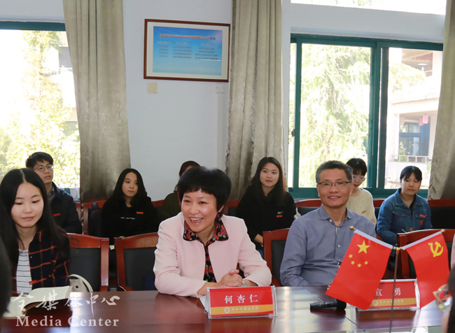 11月1日下午,党的十九大代表、省委教育工委书记何杏仁,在校党委书记宣勇的陪同下深入基层,来到开云官网英文学院英语系学生党支部中间,参加该支部学习十九大精神的座谈会。