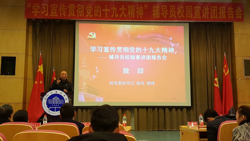为学习宣传贯彻党的十九大精神,深化“青年学子学青年习近平”学习教育,让辅导员与青年学生学在一起,讲在一起,悟在一起,真正把十九大精神内化为精神追求和行动指南,学校于1月4日举办“青春遇见十九大,与新时代共奋进”学习宣传贯彻十九大精神辅导员校园宣讲团报告会。校党委副书记赵伐出席报告会并致辞。
