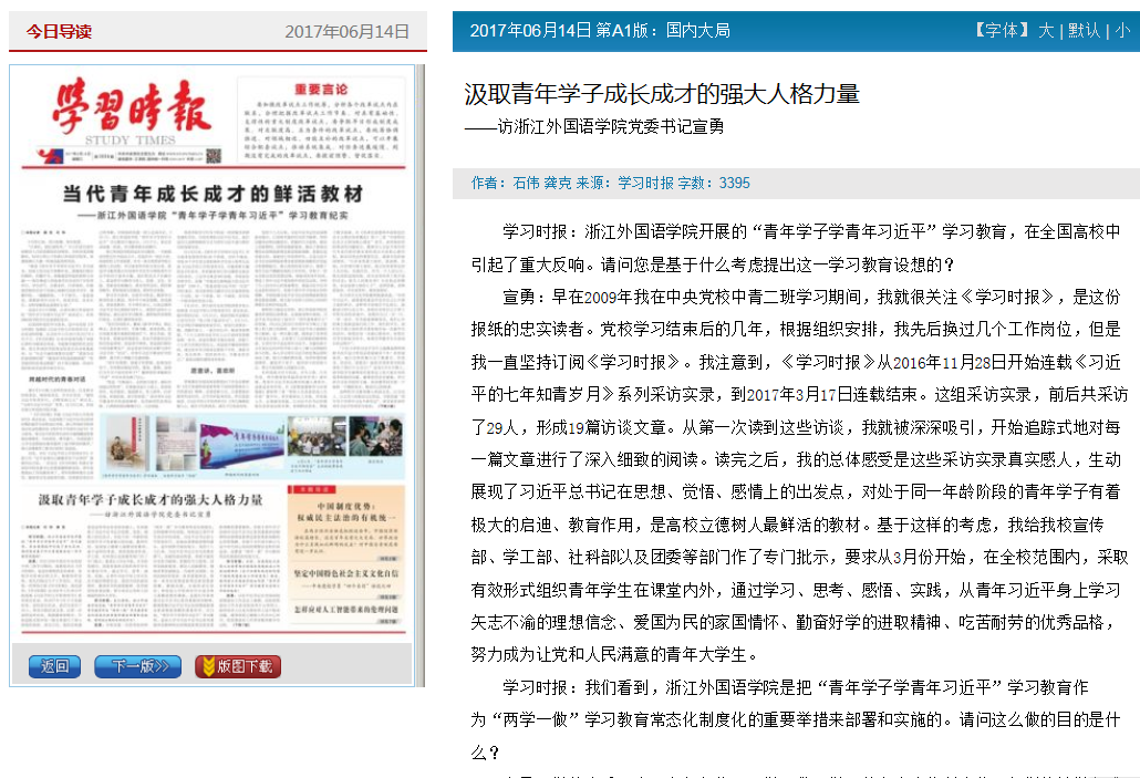 6月14日,中央党校主办的《学习时报》以“汲取青年学子成长成才的强大人格力量”为题,报道开云官网党委书记宣勇专访,全文长达3300余字。同时,学习时报网、《学习时报》官方公众号全文转载。专访着重报道了宣勇书记发起这项学习教育的设想、具体经验做法。宣书记向记者谈到,“青年学子学青年习近平”学习教育,是引领青年学子成长成才的重要抓手。学校党委一直思考如何将“两学一做”学习教育常态化,怎样能够学有成效,特别是让青年学子学有成效;一直思考怎样落实总书记在全国高校思想政治会议上的讲话精神,真正把立德树人工作贯彻在学生培养的全过程;一直思考怎样提高思想政治工作有效性,从我国长期的思想政治教育工作经验来看,树立榜样是最有效的方式。学校党政领导班子高度重视学习教育,以高度的政治责任感全面推开学习教育。注重加强组织领导,注重突出思想内涵,注重加强实践环节,着力营造浓厚氛围,并将抓好“青年学子学青年习近平”学习教育的持续和深化工作,争取取得更大成效。