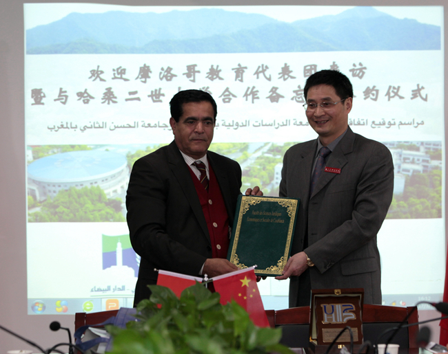 3月10日下午,校长洪岗会见摩洛哥教育代表团一行10人,并与哈桑二世大学副校长哈利迪教授签署校际合作备忘录。校党委副书记赵伐与来宾进行餐叙。