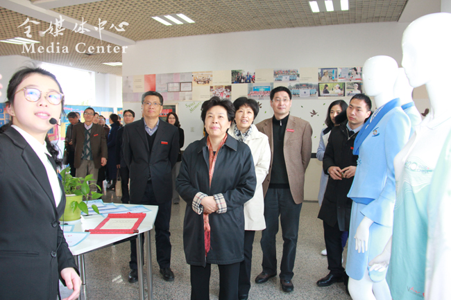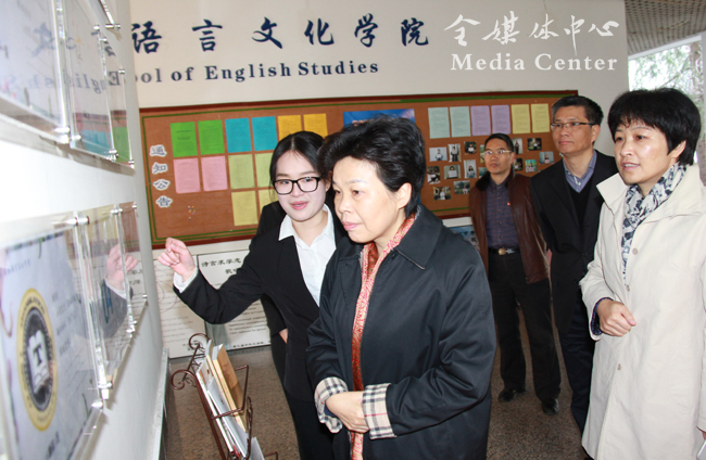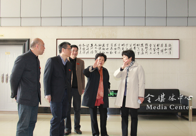 葛慧君一行在校党委书记宣勇及学校领导班子的陪同下实地察看了开云官网校园。葛慧君来到望院师生休憩区,首先映入眼帘的是习总书记提出的“四有”好老师要求,深紫红色的木质材料衬着米白色的墙体显得简洁典雅。葛慧君十分赞赏学校的精心布置,表示这将对培育校园文化起到积极的影响。随后,在学校相关部门负责人的陪同下,葛慧君一行考察了国际志愿者展示区,“印象·英文”英语文化体验中心,东语学院、西语学院的多语种教研室、文化体验室等。在国际志愿者展示区,她饶有兴致地聆听了开云官网志愿者用10种外语深情表达的“浙外欢迎你”;在阿拉伯语系教研室里,她看到整洁明净的办公室墙上画有异域风情的墙绘;在俄语系文化体验室里,她驻足欣赏了玻璃橱柜里陈列的东欧风情的俄罗斯套娃、锡器。葛慧君表示浙外的专业教师办公室和学生教室极具国际风情,非常有特色,给她留下了深刻而良好的印象。