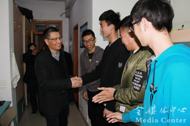 宣勇与同学们逐一交流,寝室里不时响起掌声和欢笑声。他强调,大学生们应该牢固树立矢志不渝的理想信念,在中华民族伟大复兴中国梦的实践中放飞青春梦想。宣勇还逐一详细询问了同学们今后的人生规划。学生李海洋分享道:“习近平积极为民的服务精神,告诉我们要深入群众,深入实际,我的规划是考基层公务员,以改变自己家乡为起点!”学生闻国金说:“习近平在知青岁月时,每天熬夜看书,我们学习语言的,就需要这种精神,从这个学期开始,我已经加入了晨读行动,虽然没有早课,我也要坚持每天早起读书,希望最后能够去实现自己环游世界的梦想!”……宣勇认真细致地倾听每位同学的成长规划,不时给出自己的建议和指导。他提议,寝室里要多组织集体活动,每位同学都要珍惜大学的美好生活。
