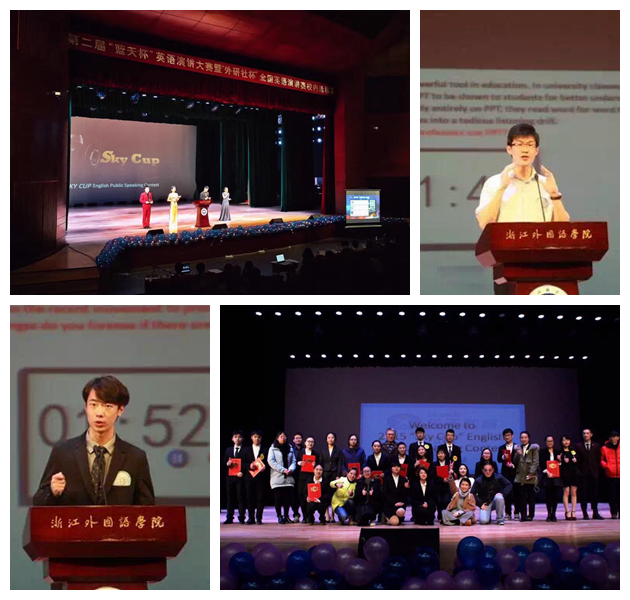 “蓝天杯”英语演讲比赛面向浙外全校学生,为每一位热爱英语的学生提供了展示自我的平台,拓展学生的全方位素质。比赛充分调动学生的积极性,活动的过程体现学生自主设计、自主实施。比赛的即兴演讲、评委提问、综合知识速答三个环节不仅考验参赛选手的英语运用能力,更是考验学生的临场应变能力。学生通过参加比赛,积累舞台经验,使其即使在大舞台上坦然面对观众,依然能用流利的英语、缜密的逻辑征服观众,在聚光灯下仍能大胆思其所思、说其所要。这不仅锻炼了心理素质,也为自身英语素质打下更夯实的基础。
