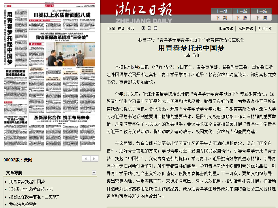 5月9日,浙江卫视《浙江新闻联播》“我省举行‘青年学子学青年习近平’教育实践活动座谈会”(视频见页首)