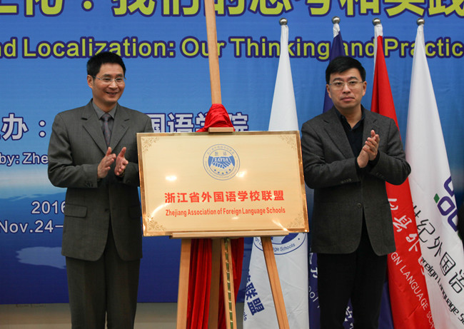 会上,洪岗与舒培冬为“浙江省外国语学校联盟”揭牌。