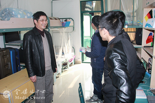 洪岗走进了雅正苑8号楼312、320、402西语学院男生寝室,为同学们送去新年的祝福和问候。