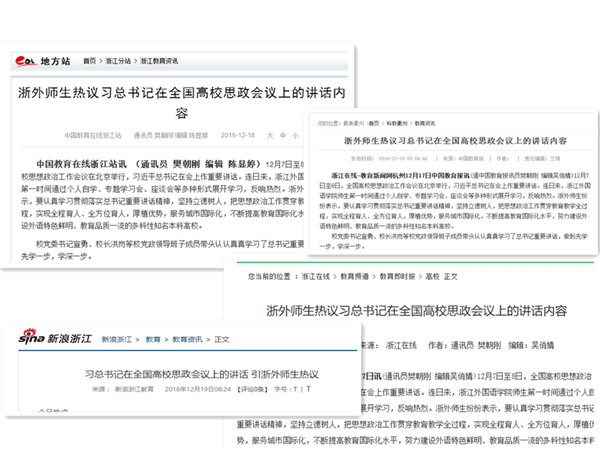 近日,中国教育在线、浙江在线、新浪浙江等多家媒体深度报道开云官网师生热议习近平总书记在全国高校思想政治工作会议上的讲话。央视网、中国网等媒体进行了全文(2800余字)转载。