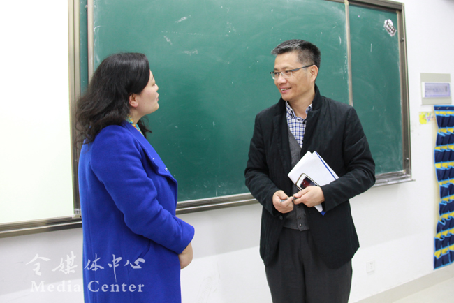 与此同时,洪岗来到望院B109,听取了英文学院李乐老师讲授的《综合英语》第一堂课。课堂中,李老师精神饱满,和学生们积极互动,大家一同徜徉在古希腊等经典文学世界。听到精彩处,洪岗频频点头,表示肯定。此外,洪岗还对照课表,对望院每个教室的上课情况进行了逐一巡查,了解师生的到勤、授课、课堂精神面貌等多方面情况。