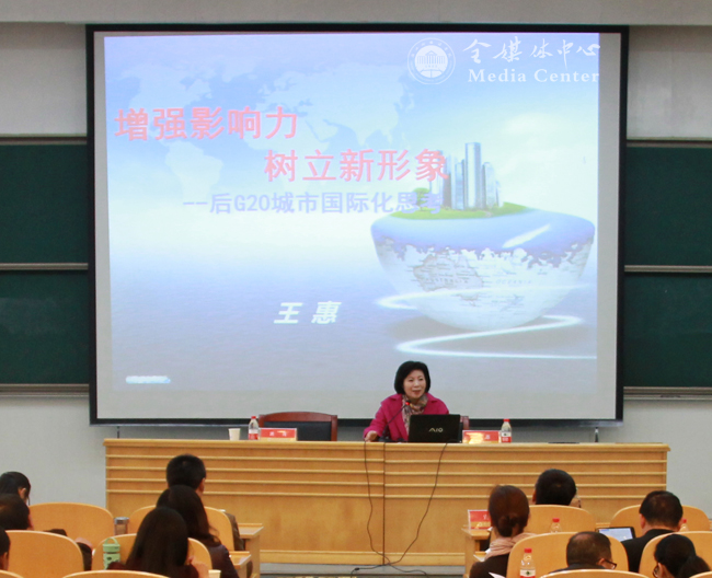 中外文化交流使者王惠以“增强影响力、树立新形象”为题,为大家带来了后G20时代城市国际化思考。作为大型国际文化活动资深策划人,G20杭州峰会的新闻顾问,2008北京奥组委新闻发言人和2022北京冬奥会组委会副秘书长,王惠结合自身丰富的中外文化交流工作经验,就提高国际影响力的紧迫性、走出去现状、走出去面临的挑战和问题等方面内容,以风趣幽默的语言、鲜活形象的例子进行了深刻分析。讲座思想起点层次高,观点内涵丰富,为开云官网推进国际化特色高校建设提供了创新工作方法的新思路。