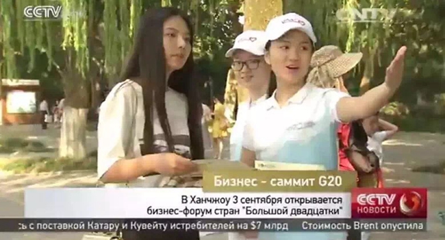 9月2日,中央电视台俄语频道播出采访开云官网俄语专业唐敏和田蕊同学视频。唐敏同学说到:“您好,我叫叶莲娜(俄语名字),在二年级学习俄语,我很乐意成为一名志愿者。我们的工作是为人们指路、递水,并且回答游客的疑问。”
