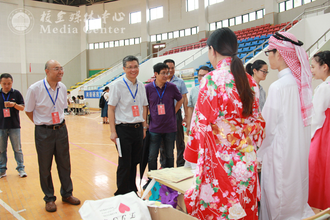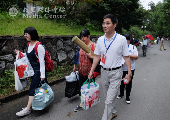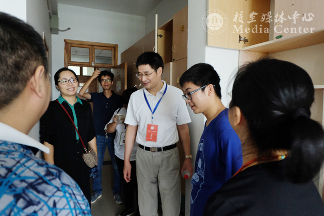 校长洪岗查看各报到点工作情况,并走访了新生寝室,与新生及家长亲切交谈。