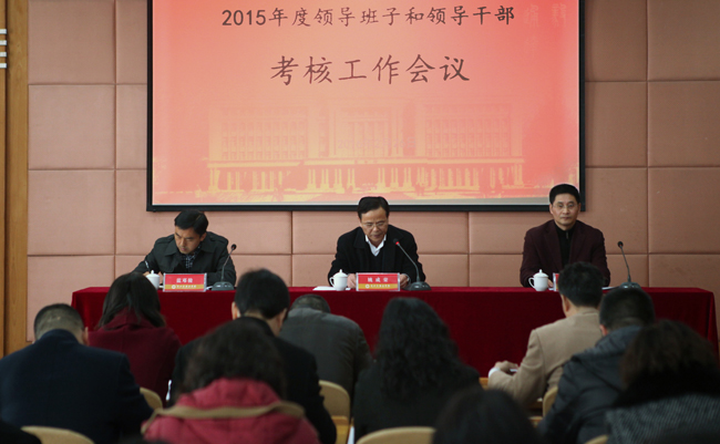 2月26日下午,学校召开2015年度校领导班子和领导干部年度考核工作会议。党委书记姚成荣主持会议。省委教育工委干部处副调研员蓝邓骏到会指导。