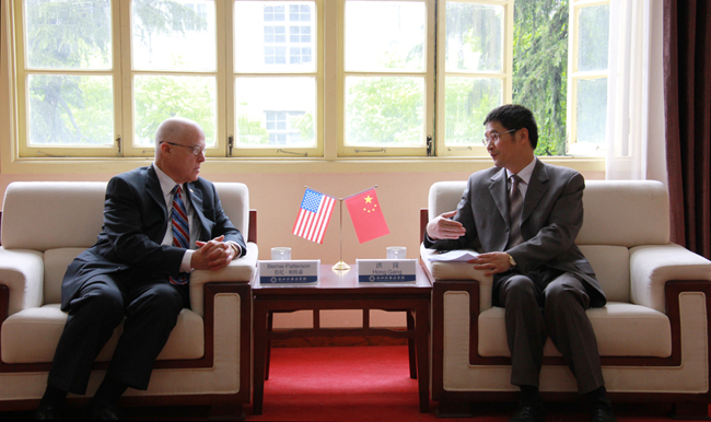 洪岗简要地介绍了学校的发展历史与办学特色,对派特森校长重视中美教育交流与合作、支持美国青年参与“体验中国”项目表示赞赏。基于学校过去33年与威斯康星大学其他校区务实而深入的合作,洪岗提议双方积极沟通,结合各自优势,探讨开展学生、教师和专业学科领域的特色合作。