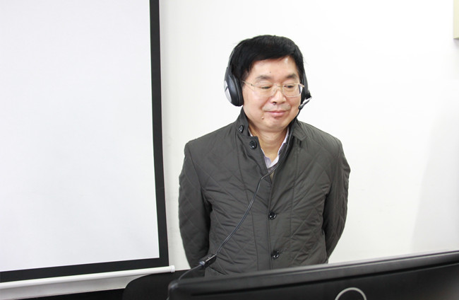 在同声传译实验室,郑省长看到“三位一体”口译专业的二年级学生正在进行口译训练,也饶有兴致地戴上了耳机,亲身体验了一次同声传译复述练习。他感叹道:“还是有一定难度的”。